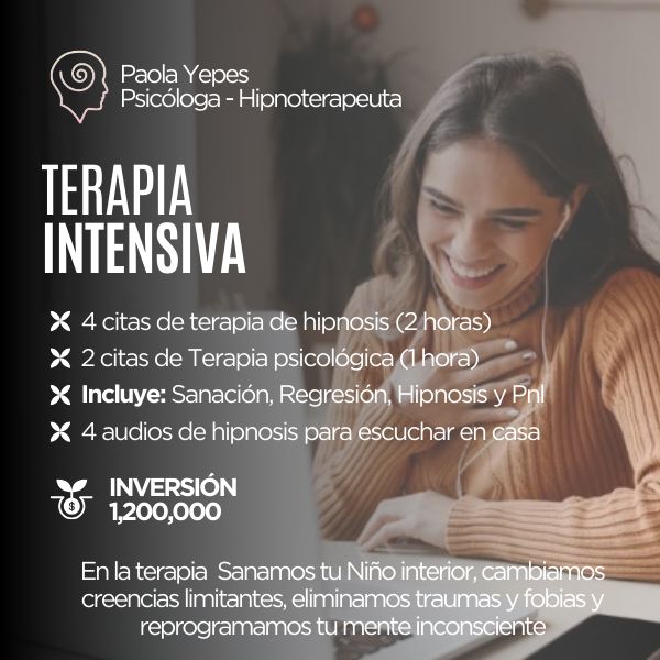 * 4 citas de terapia de hipnosis (2 horas cada una): Sesiones profundas para trabajar directamente con tu inconsciente a través de Sanación, Regresión, Hipnosis y PNL.